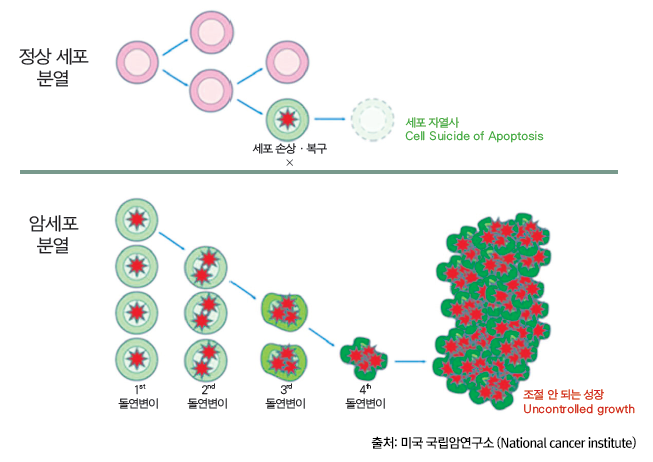±×·¸´Ù¸é ¾Ç¼º Á¾¾ç(¾Ï)ÀÌ ¾ç¼º Á¾¾çÀ̳ª Á¤»ó Á¶Á÷°ú ´Ù¸¥ Á¡Àº ¹«¾ùÀϱî¿ä? ¾Ï¼¼Æ÷´Â À¯ÀüÀÚ º¯ÇüÀÌ ÀÏ¾î³ ºñÁ¤»ó ¼¼Æ÷·Î Á¤»ó ¼¼Æ÷¿Í ´Ù¸¥ µÎ °¡Áö Å« Ư¡À» °¡Áý´Ï´Ù. ù°´Â Á¶ÀýÀÌ ¾È µÇ´Â ¼¼Æ÷ Áõ½ÄÀÔ´Ï´Ù. Á¤»ó ¼¼Æ÷´Â ¾î´À Á¤µµ ºÐ¿À» Çϸé À¯ÀüÀÚ¿¡ ÀÇÇØ¼ Á¶ÀýÀÌ µÇ¾î ÀÚµ¿ÀûÀ¸·Î ºÐ¿ÀÌ ¸ØÃß°Ô µË´Ï´Ù. ±×·¯³ª ¼¼Æ÷ ºÐ¿À» Á¶ÀýÇÏ´Â À¯ÀüÀÚ¿¡ µ¹¿¬º¯À̰¡ »ý±ä ¾Ï¼¼Æ÷´Â ¼¼Æ÷ Á¶Àý ´É·ÂÀ» ÀÒ¾î¹ö¸®°Ô µÇ¾î ¾Æ·¡ ±×¸²Ã³·³ ¼¼Æ÷°¡ °è¼Ó ºÐ¿ÇÏ¸é¼ Áõ½ÄÇØ¼ ȤÀ» ¸¸µé°Ô µË´Ï´Ù.