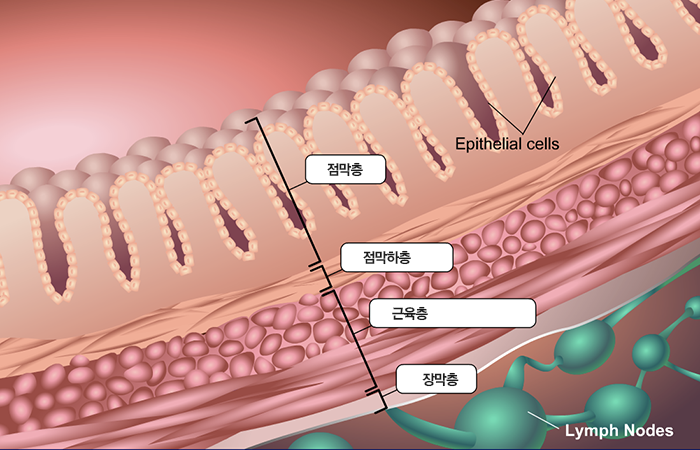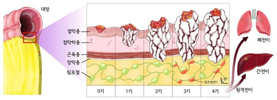 Á¡¸·Ãþ¿¡¼ ¹ß»ýÇÑ ´ëÀå¾ÏÀÌ ÁøÇàµÇ¸é Á¡Á¡ ¾Æ·¡ÃþÀ» ÆÄ°í µé¾î°¡ Á¡¸·ÇÏÃþ, ±ÙÀ°Ãþ, À帷Ãþ ¼ø¼·Î ħÅõÇØ¼ ÀÚ¶ó°Ô µË´Ï´Ù. ´ëÀåÀÇ 4°³ÃþÀ» ´Ù ¶Õ°í ³ª°£ ´ëÀå¾ÏÀº ´ëÀå ÁÖº¯ÀÇ Àå±â¿Í ¸²ÆÄÀýÀ» ħ¹üÇÏ°Ô µÇ°í Á»´õ ÁøÇàµÇ¸é ¸²ÇÁ°üÀ̳ª Ç÷°üÀ» ÅëÇØ ´ëÀå¿¡¼ ¸Ö¸® ¶³¾îÁø °£À̳ª Æó·Î ÆÛÁö°Ô µË´Ï´Ù´Ù. ÀÌ·¸°Ô ¿ø·¡ ¾ÏÀÌ ¹ß»ýÇÑ À§Ä¡¿¡¼ ¸Ö¸® ¶³¾îÁø Àå±â·Î ÆÛÁö´Â °ÍÀ» ÀüÀÌ(metastasis)¶ó°í ÇÑ´Ù. ÀÌ·¸°Ô ´ëÀå¾ÏÀÌ ÁøÇàÇØ¼ ³ª°£ Á¤µµ¸¦ ³ªÅ¸³½ °ÍÀ» ´ëÀå¾ÏÀÇ º´±â(staging)¶ó°í ÇÑ´Ù. ´ëÀå¾ÏÀÌ Á¡¸·Ãþ¿¡ ¸¸ ±¹ÇÑ µÇ¾î ÀÖ´Â °æ¿ì´Â 0±â, Á¡¸·ÇÏÃþÀ» ħ¹üÇÑ °æ¿ì´Â 1±â, ±ÙÀ°Ãþ°ú À帷ÃþÀ» ħ¹üÇÑ °æ¿ì´Â 2±â, 4°³ÃþÀ» ´Ù ¶Õ°í ÁÖº¯ Àå±â¿Í ¸²ÇÁÀýÀ» ħ¹ü ÇÑ °æ¿ì´Â 3±â, ´ëÀå¿¡¼ ¸Ö¸® ¶³¾î Áø Æó¿Í °£ µîÀÇ Àå±â·Î ÆÛÁø °æ¿ì´Â 4±â·Î ºÐ·ùÇÕ´Ï´Ù. ÀÌ·¯ÇÑ º´±â¿¡ µû¶ó ´ëÀå¾ÏÀÇ Ä¡·á ¹æÇâÀÌ °áÁ¤µË´Ï´Ù.
